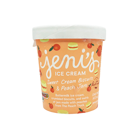 Experience the taste of summer with Jeni's Sweet Cream Biscuits & Peach Jam Ice Cream. This delectable flavor blends creamy sweet cream ice cream with chunks of buttery biscuits and swirls of vibrant peach jam. Each spoonful offers a harmonious mix of rich, smooth creaminess, comforting biscuit crunch, and the fruity brightness of ripe peaches, creating a refreshing and indulgent treat.